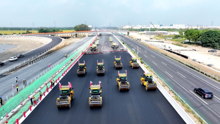 沪武高速施工现场,2台摊铺机+12台压路机组成“全球最大规模智慧施工集群”。