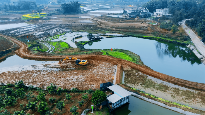 继续向东,这里是万里长江第一城——宜宾,在宜宾江安县阳春镇,5000亩高标准农田建设进入尾声,项目高峰期投入30余台徐工挖掘机。