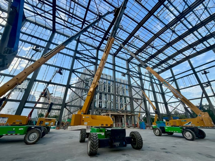 这些高空作业平台构成了施工主力,其卓越的高空稳定性和精准的微动性,为钢结构的高质量焊接提供了坚实可靠的作业平台。它们的纯电动动力确保了在密闭的厂房空间内零排放,完全满足了精密制造对于环境清洁度的要求,同时避免了焊接作业因尾气污染而产生的质量风险。