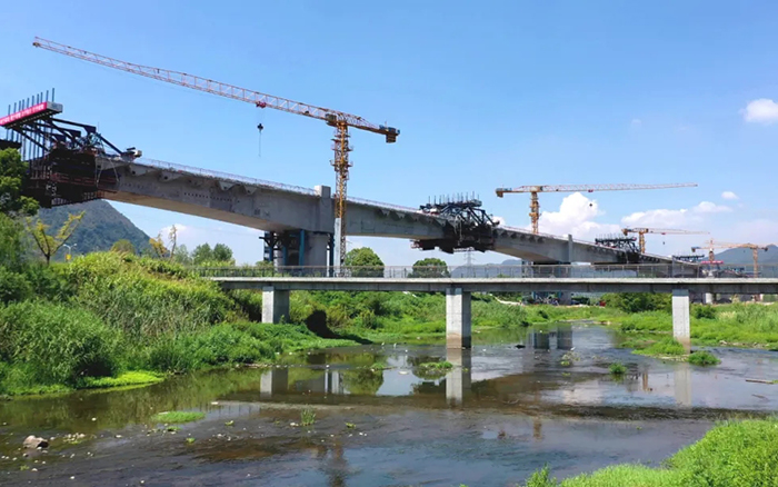 集安全、可靠、高效于一身的徐工XGT6515B-10S、XGT7022-12S等产品沿桥而立,主要负责项目中墩身钢筋吊装、模板安拆等工作。