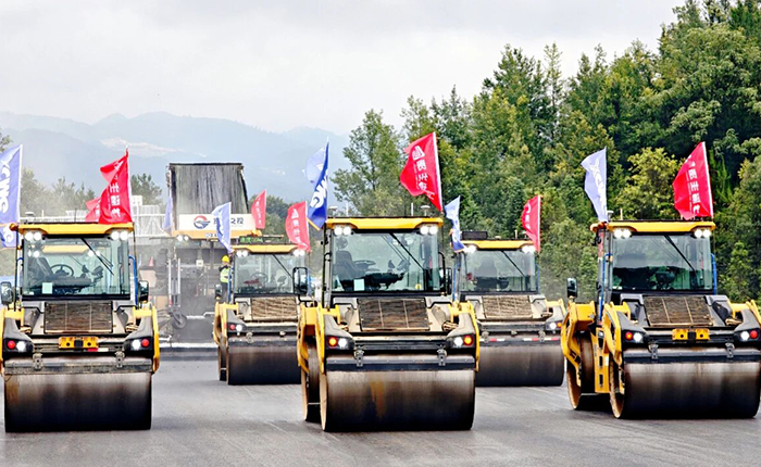 智慧施工管理平台实时呈现碾压轨迹、变速曲线、施工速度及温度数据。摊铺机高效输分料系统适配超宽幅作业,压路机深入结构层实现全维度压实,昼夜不间断施工。