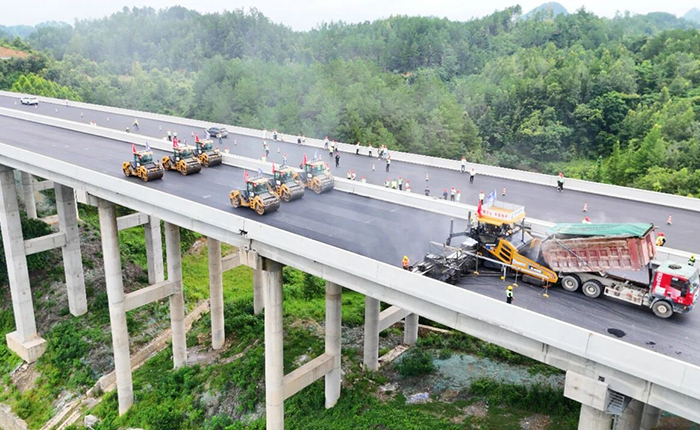 徐工道路智慧施工集群为贵平高速建设注入核心动能。1 台 RP2205HD 摊铺机与 6 台无人驾驶压路机(3 台 XD135T、3 台 XD135TVO)协同作业,实现 15.25 米超宽摊铺与 5 厘米精准控制,压实密度达 97% 以上,平整度优于 0.4,渗水构造深度合格率 100%。