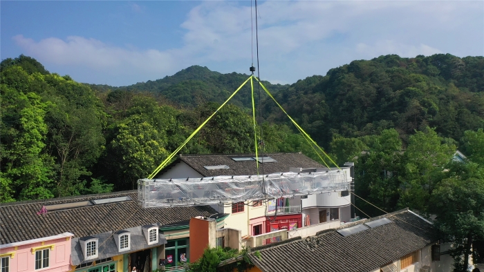 在杭州大清谷影视拍摄基地,一场“静默式”吊装正在上演。全球首款四桥八节臂130吨汽车起重机——徐工G2代XCT130G8-1,将20米长、2.5吨重的剧组灯架稳稳送至跨度46米外的房屋上空。而这一“定格”,就是整整三天。