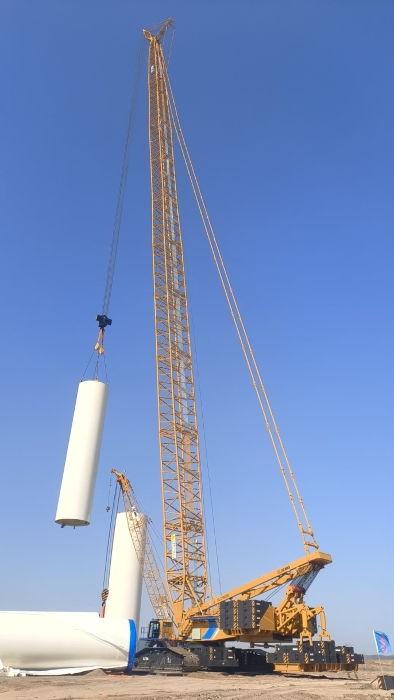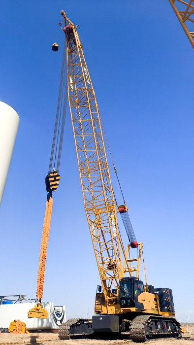 近日,在我国西北某风电场,徐工XLC15000(1000吨级)履带起重机,以132+12米标准风电工况,精准将重达34吨的风机叶片平稳吊装至百米高空,圆满完成10兆瓦风机吊装任务。