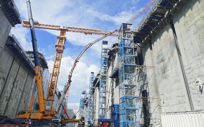 平陆运河枢纽正全速推进徐工大米数泵车以傲人高度