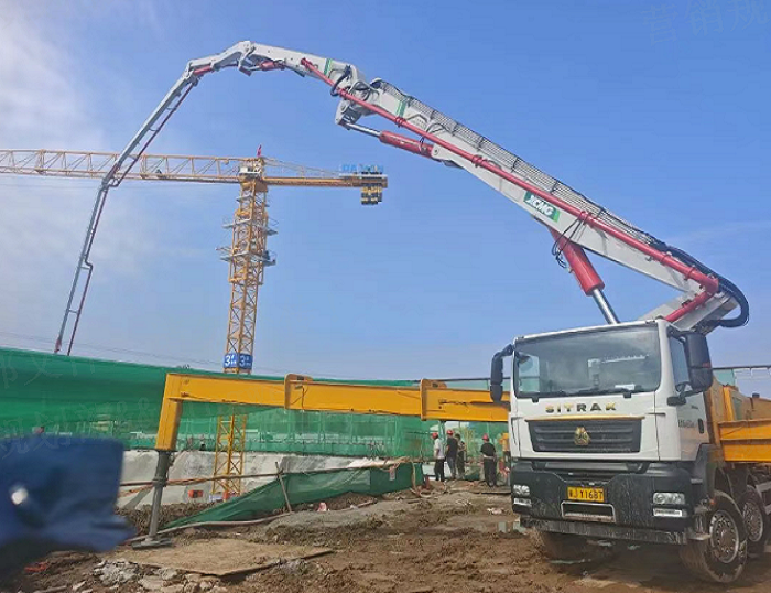 面对设备交叉施工,作业空间受限。62米泵车凭借单侧支撑模式,仅用一半场地就完成了稳定架设。