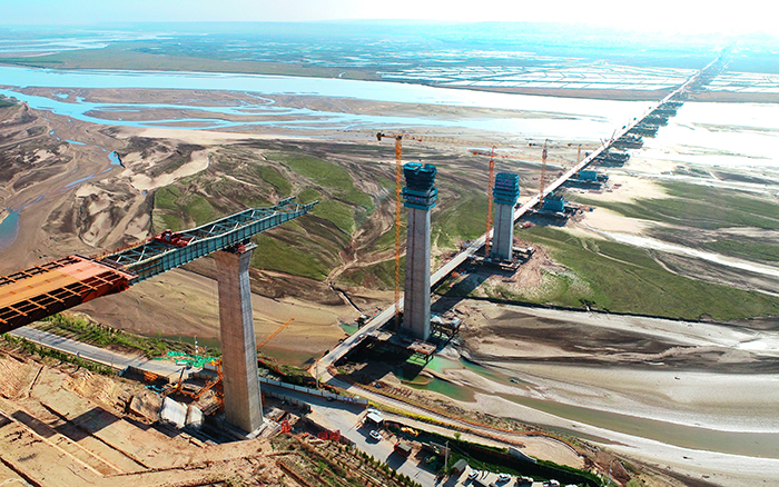项目施工地点临近黄河,地质结构复杂、空气湿潮。同时,大桥主桥最高墩是钢箱梁连续顶推施工节点的控制性桥墩,施工难度大、风险高、工期要求紧。