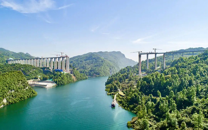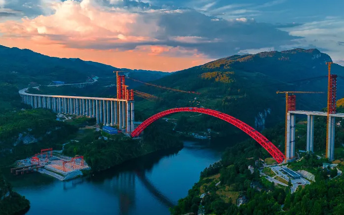 乌江特大桥全长1834米,主桥为504米上承式钢管混凝土拱桥,是德余高速公路的重要控制性工程,也是世界最大跨径上承式钢管混凝土拱桥。大桥采用的拱、柱、梁全固结无支座整体式受力体系为国内首创,施工极具难度,代表了目前同类型桥梁建造的世界顶级水平。