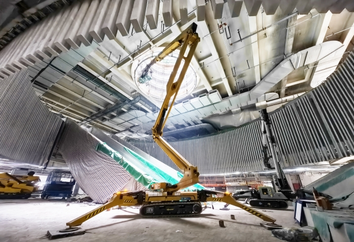现场,徐工多台XGA26X-Li蜘蛛履带式曲臂高空作业平台正在如火如荼进行室内施工作业,主要负责博物馆大楼四楼中厅内部的装修安装,作业区域总高20米,空间狭小且需跨障作业,常规车辆无法同时满足这两个作业条件,蜘蛛车凭借0.99m超窄车身及13.2m作业幅度,成为施工方的绝佳选择,完美适应现场紧急的竣工工期,获得现场施工方一致好评。