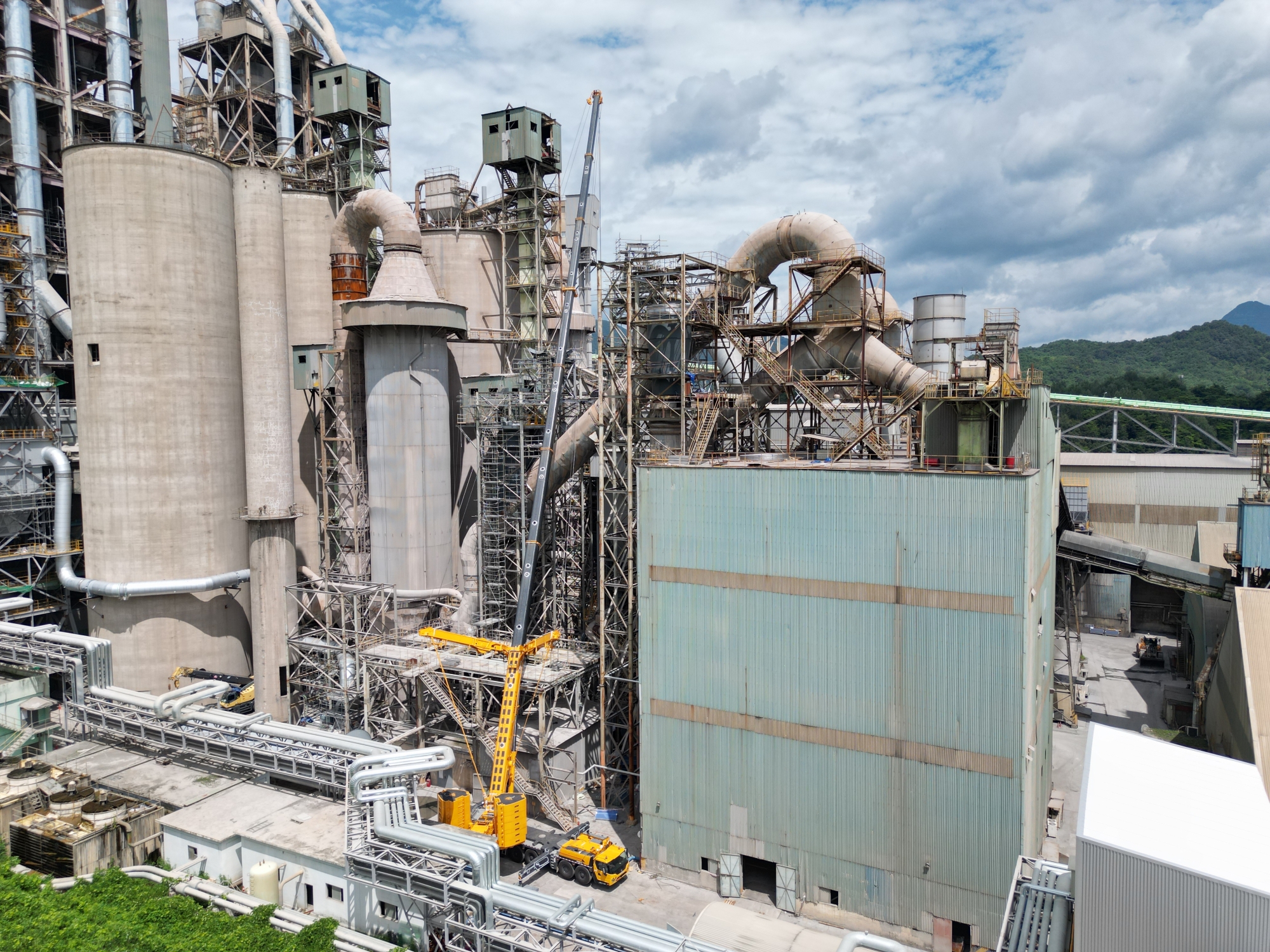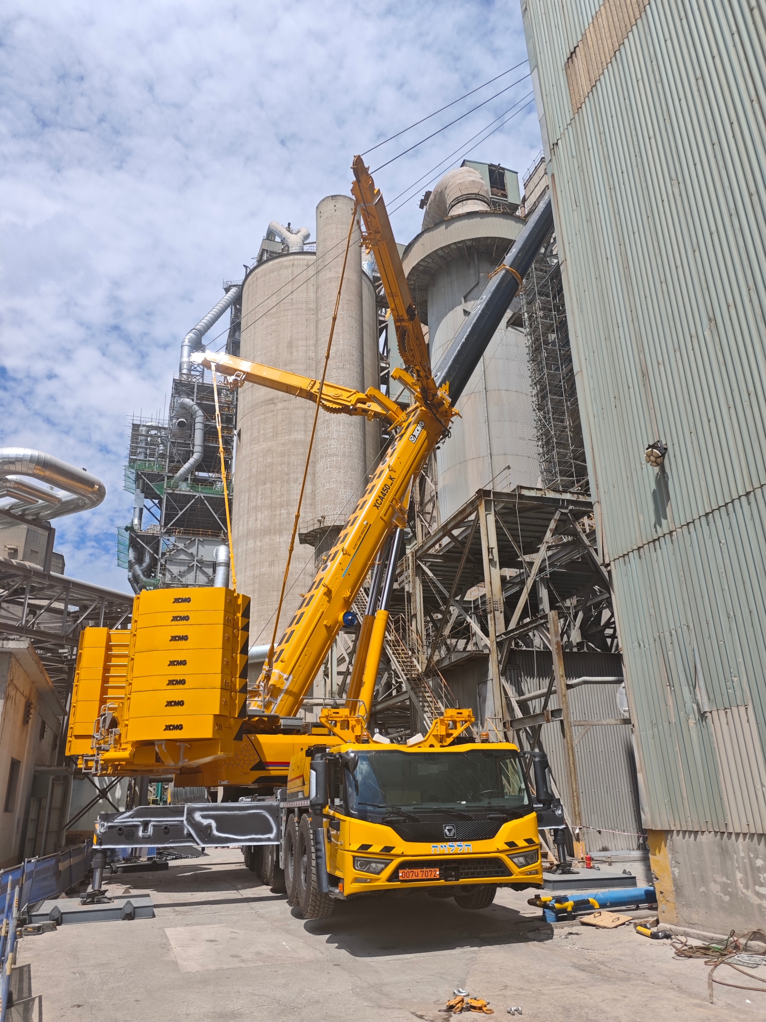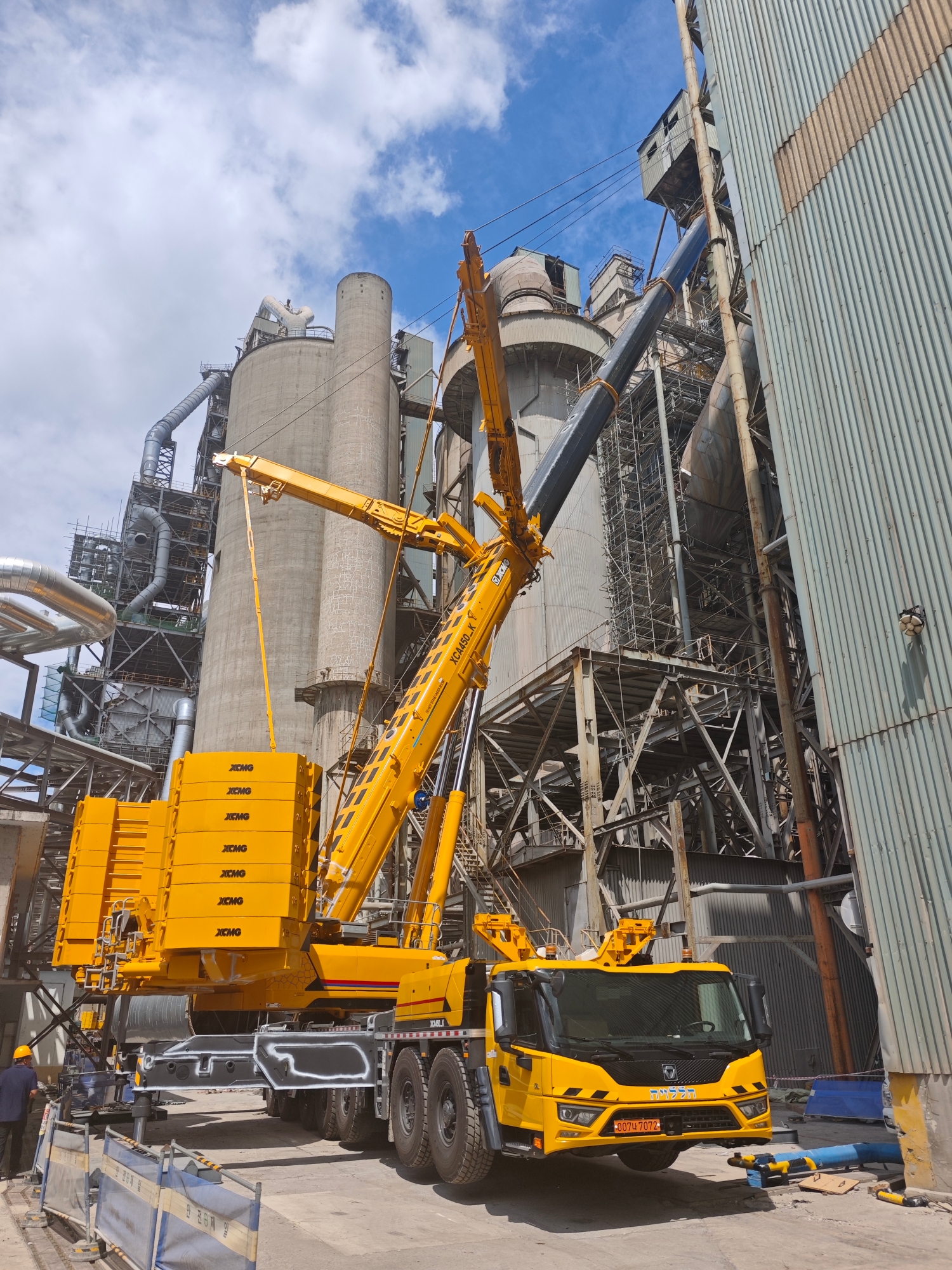 在现代大型水泥厂的建设与升级改造中,设备安装往往是决定工程进度的关键环节。近日,在某现代化水泥厂施工现场,一台徐工XCA450_K全地面起重机凭借其卓越性能,成功完成了一项超起工况下的高难度吊装任务,为项目的顺利推进提供了坚实保障。