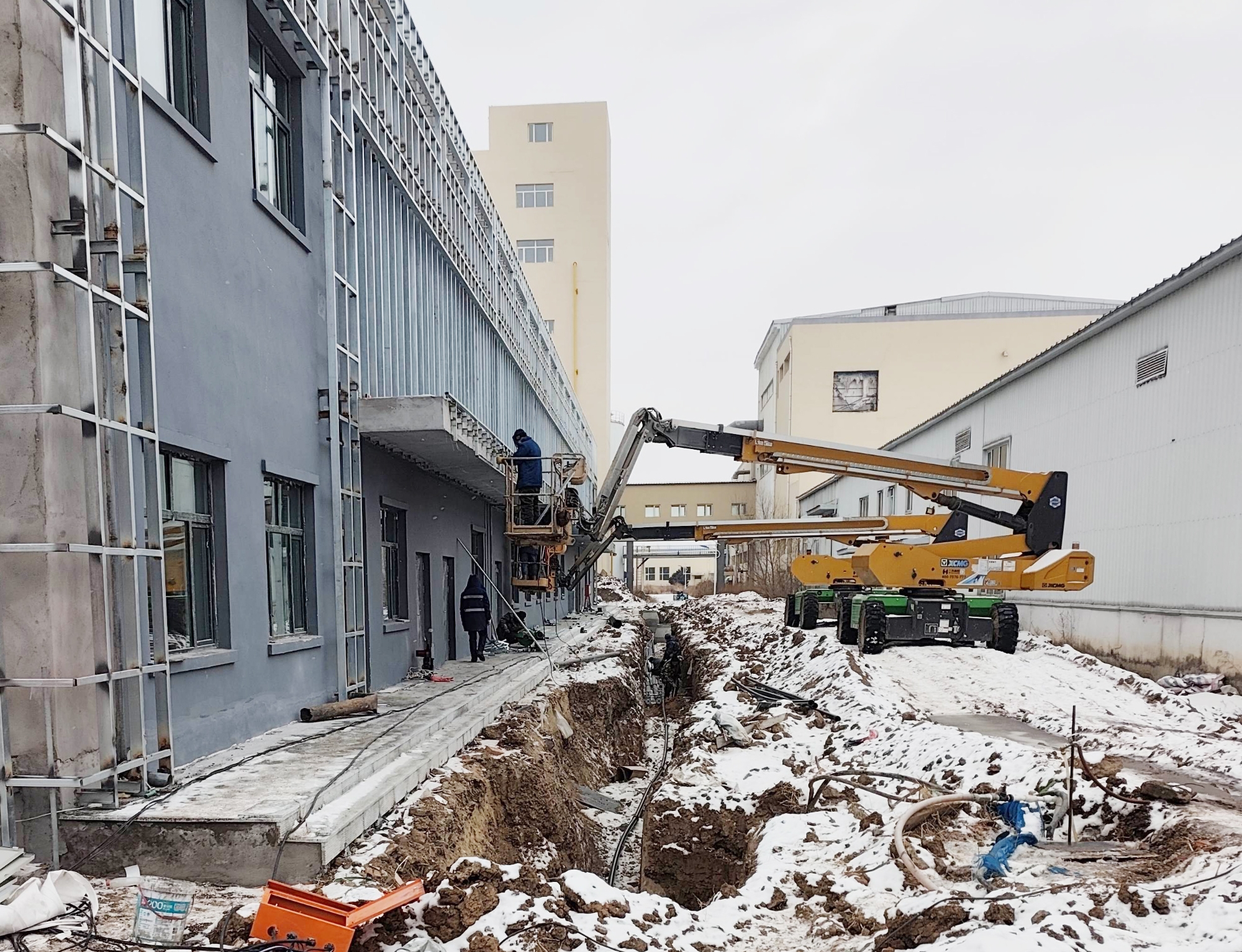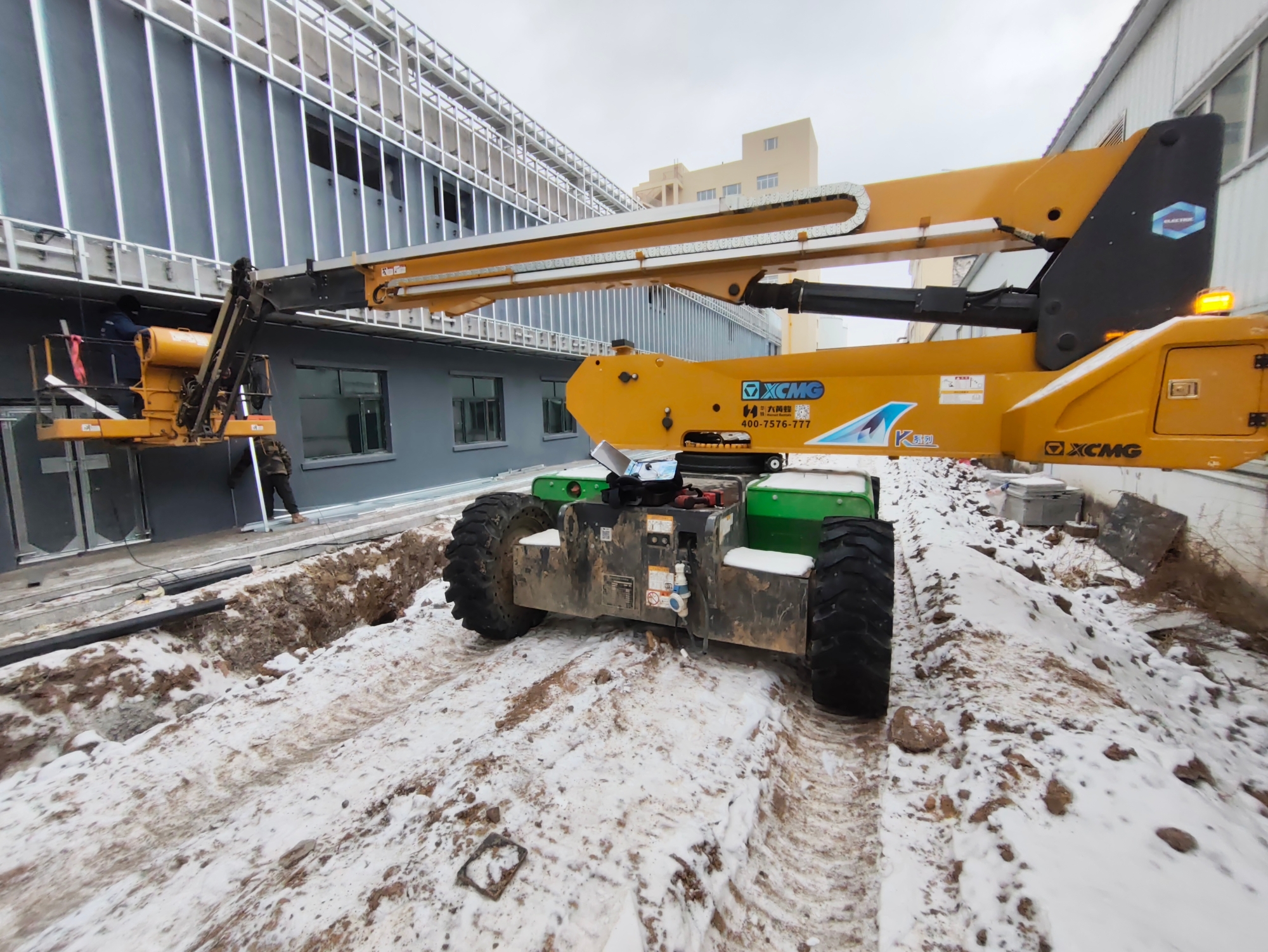 在黑龙江哈尔滨北大荒绿源冷链管理中心建设现场,冬日的冰雪覆盖着施工场地,徐工高空作业平台却依旧高效运转,成为项目外立面施工的核心设备。