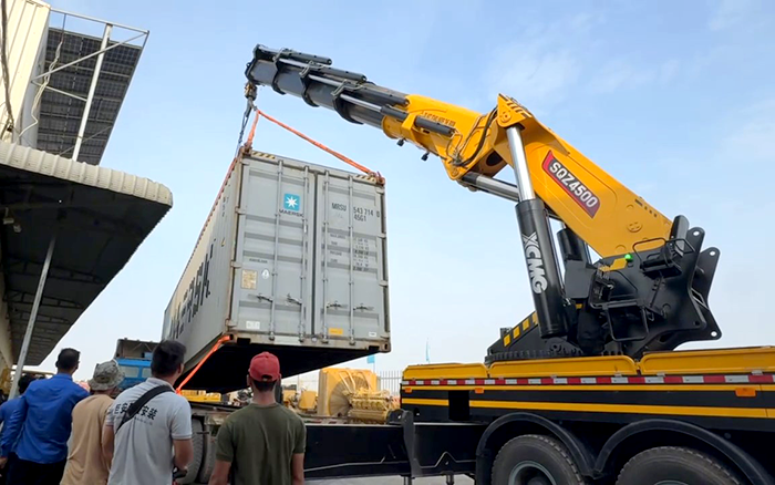 凉季东南亚,某码头货箱错落排布。徐工 SQZ4500C 折叠臂起重机静静伫立,伸展臂架,开启一天的集装箱转运作业。