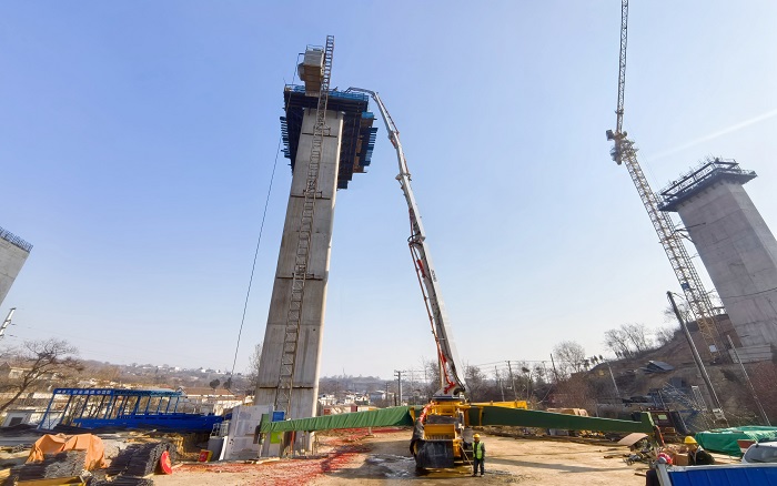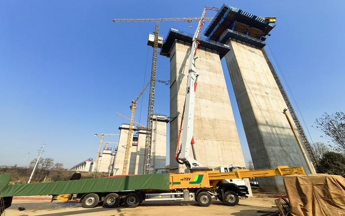 65米高空,72米长臂——在河南焦平高速施工现场,徐工72米泵车以“空中搭桥”之势攀越桥墩,稳稳输送。