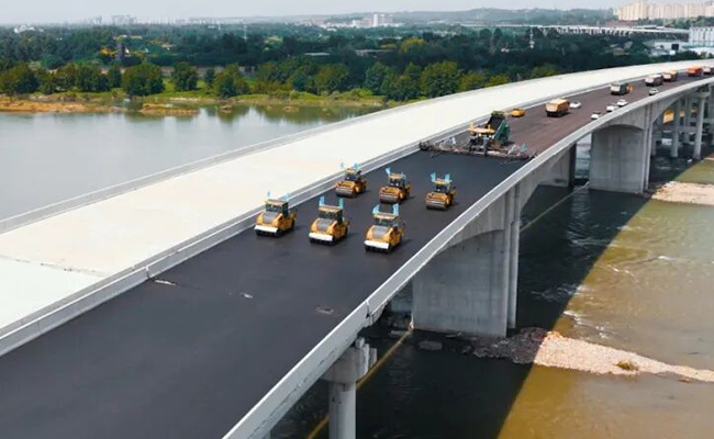 此次施工路段是典型的“桥梁密集型”路段,桥梁工程占比高达95.5%,且桥面铺装宽度频繁切换,从24.5米宽幅主线到19.4米窄幅匝道,过渡段线形衔接与高程控制需达到毫米级精度。针对窄幅匝道空间受限、横坡多变的特点,采用伸缩摊铺机与“分段精准压实”传统工艺组合模式,克服空间作业限制;针对宽幅与窄幅过渡段,优化摊铺搭接工艺设置渐变过渡带,精准控制衔接处高程与平整度偏差,确保压实质量达标。最终实现平整度<0.5、压实度≥99.8%,全面高质达标。