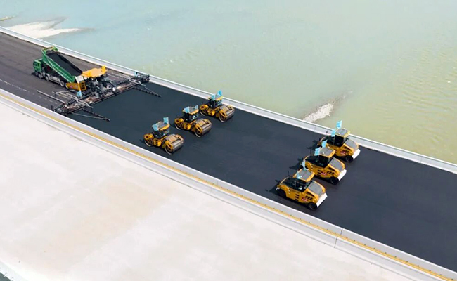 项目协调难度大,且易延误工期,徐工针对性部署智慧施工集群,采用“大宽度摊铺+北斗无人碾压”方式,超宽幅摊铺机一次摊铺成型,数字化智能施工系统通过预设参数,实现碾压轨迹、遍数与温度的精准控制,从而显著提升施工效率,快速推进宽幅段落施工。