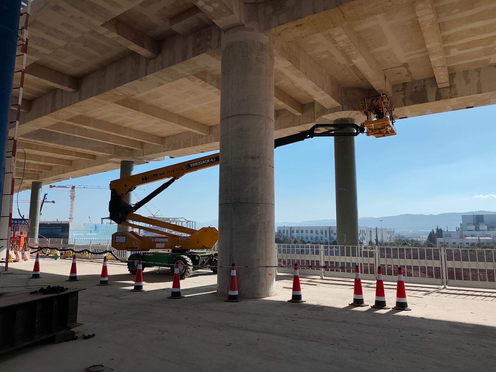 T2 航站楼采用大跨度异形曲面结构,作业空间复杂、精度要求高。徐工 XGS22ACK-Li 最大作业高度达 22.9 米,最大作业幅度 15.4 米,可轻松覆盖航站楼主体施工区域;平台额定载荷最高 460kg,满足多人同步作业与工具材料搭载需求,大幅提升施工效率。