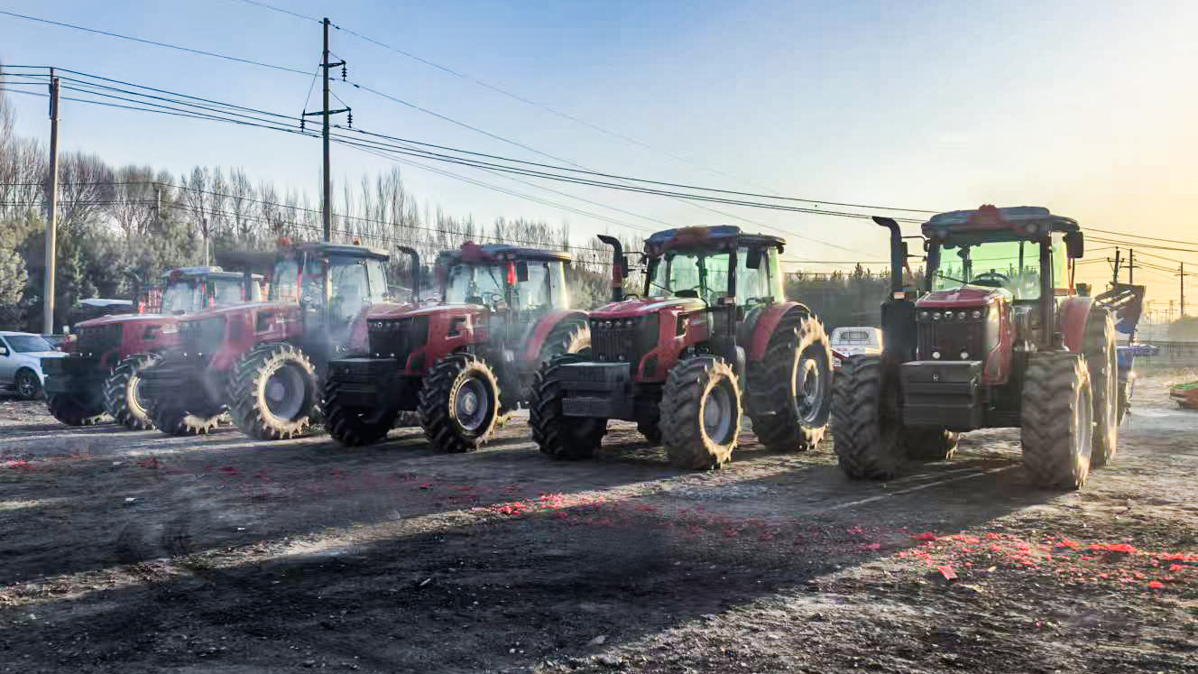 其中1台徐工2204-6DK大马力拖拉机,搭配液压翻转犁,以澎湃动力深翻沃土,每一次犁铧翻转都精准破茬、碎土、起垄,将深层土壤彻底唤醒,为作物扎根筑牢根基;4台徐工1604-6BK拖拉机,挂载驱动耙同步作业,耙齿高速运转,精准碎土、整平、保墒,一耙到位,让地块达到“地平、土细、墒足”的播种黄金状态。