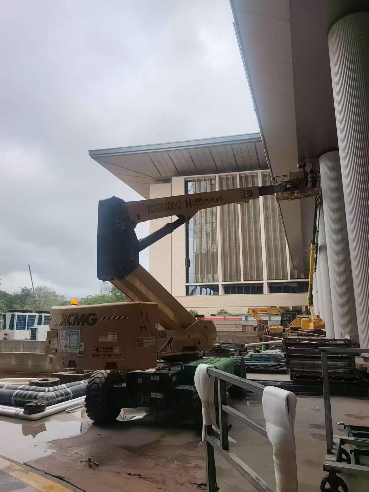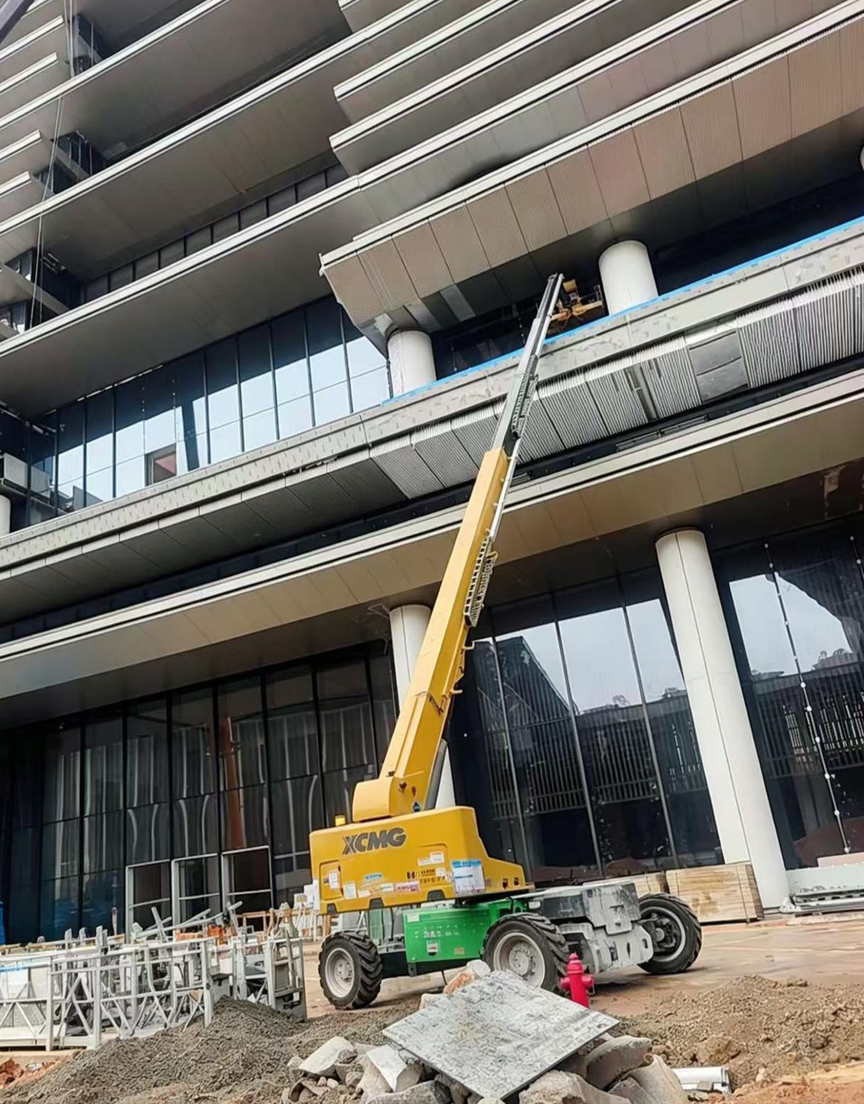 当“鹏起山海,环宇飞扬”的异形曲面从图纸走向现实,传统平面幕墙的“二维坐标定位”逻辑已彻底失效——每个双曲面单元板块在X/Y/Z轴坐标、法线角度和曲率半径上均不相同,定位误差一旦超过毫米级便可能导致缝隙不均甚至无法安装。针对这一痛点,徐工XGA16ACK-Li锂电曲臂高空作业平台凭借Σ型组合式臂架与7.6米的超强跨越净空高度,在建筑立面的窗花元素与洞石装饰区域灵活穿行,精准完成复杂异形构件的毫米级就位。