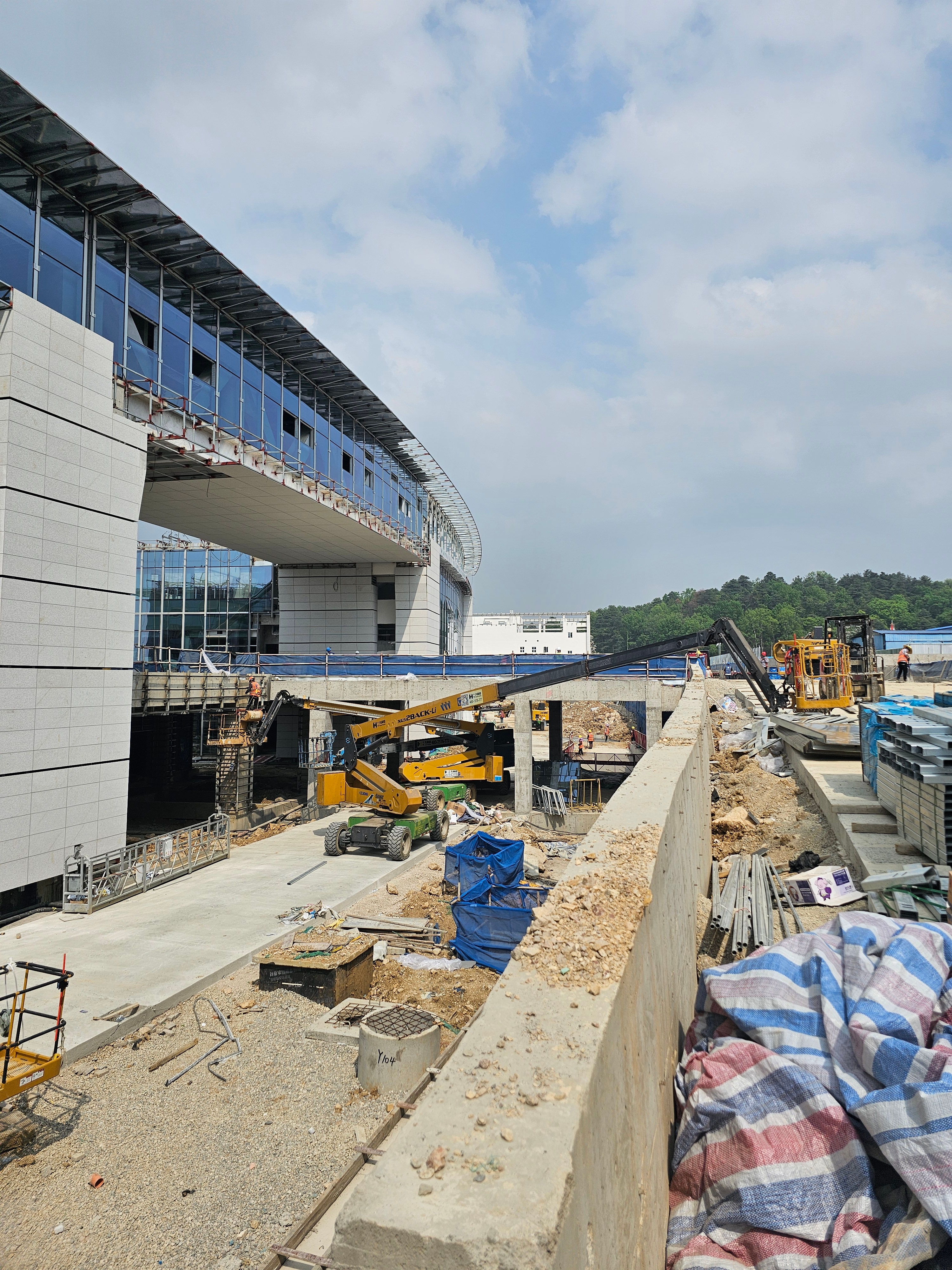 在贵阳某交通枢纽项目的施工现场,多台徐工 XGS28ACK-Li 电动臂车火力全开,高效破解复杂工况难题,成为项目建设的 “硬核主力军”。施工难点重重:建筑外立面呈弧形设计,幕墙、钢结构施工点位分散且高度跨度大;场地交叉作业密集,地面路况复杂,狭窄通道通行难度高;同时,项目对绿色施工要求严苛,传统燃油设备的噪音与排放问题难以适配。