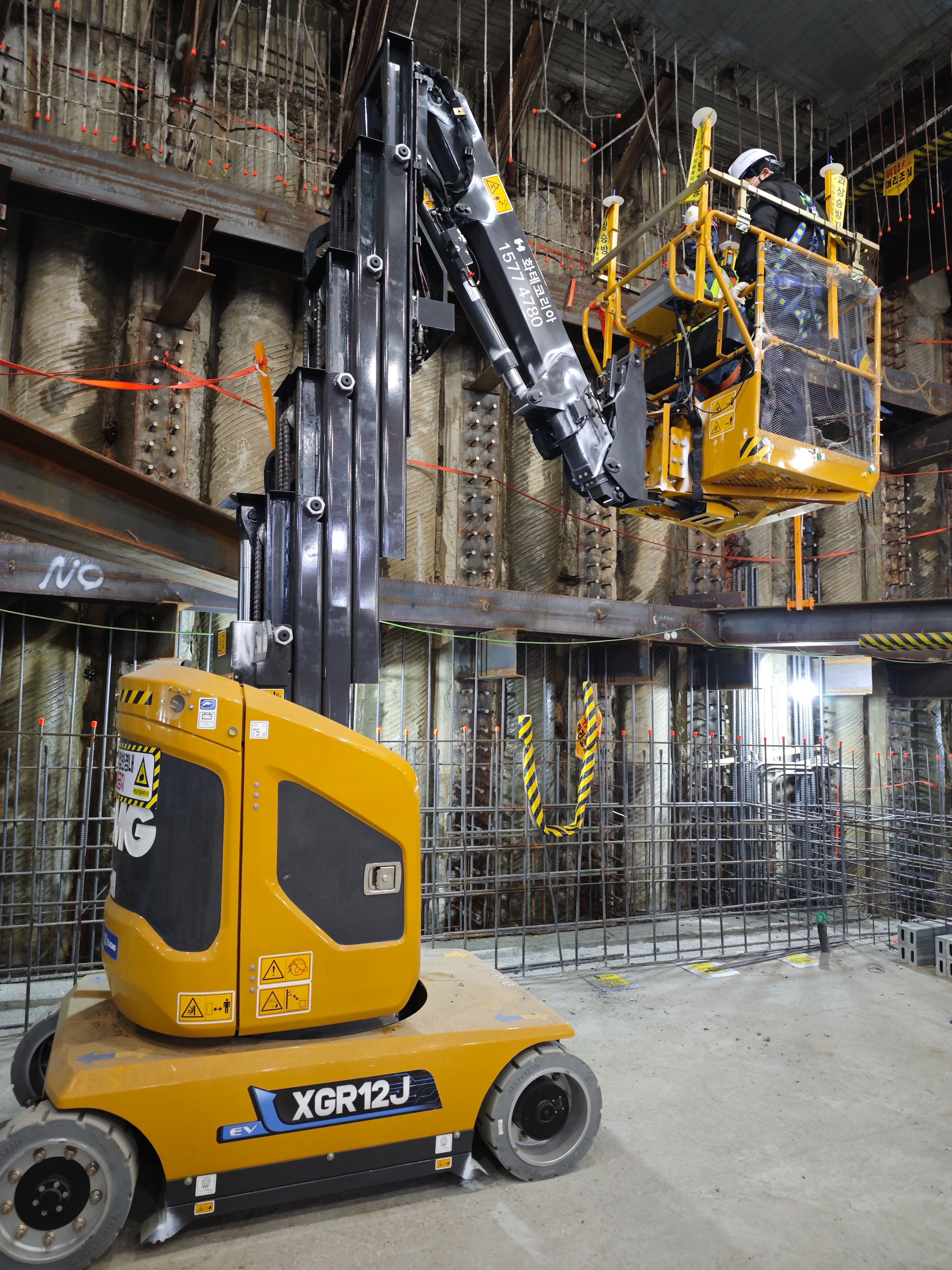 在韩国首尔某地下商场改造项目内,工况难点十分突出:一是作业空间极度受限,商场地下区域梁柱密集、钢筋与支撑结构交错,常规高空设备因体型过大无法进入,顶棚防水施工面临 “设备进不去、作业够不着” 的困境;二是场地地面多为硬化地面,且遍布钢筋、管线等障碍物,对设备的通行灵活性与转向能力提出极高要求;三是地下施工对噪音、排放有严格限制,传统燃油设备的尾气与噪音不仅影响施工安全,也无法满足项目的环保施工标准。