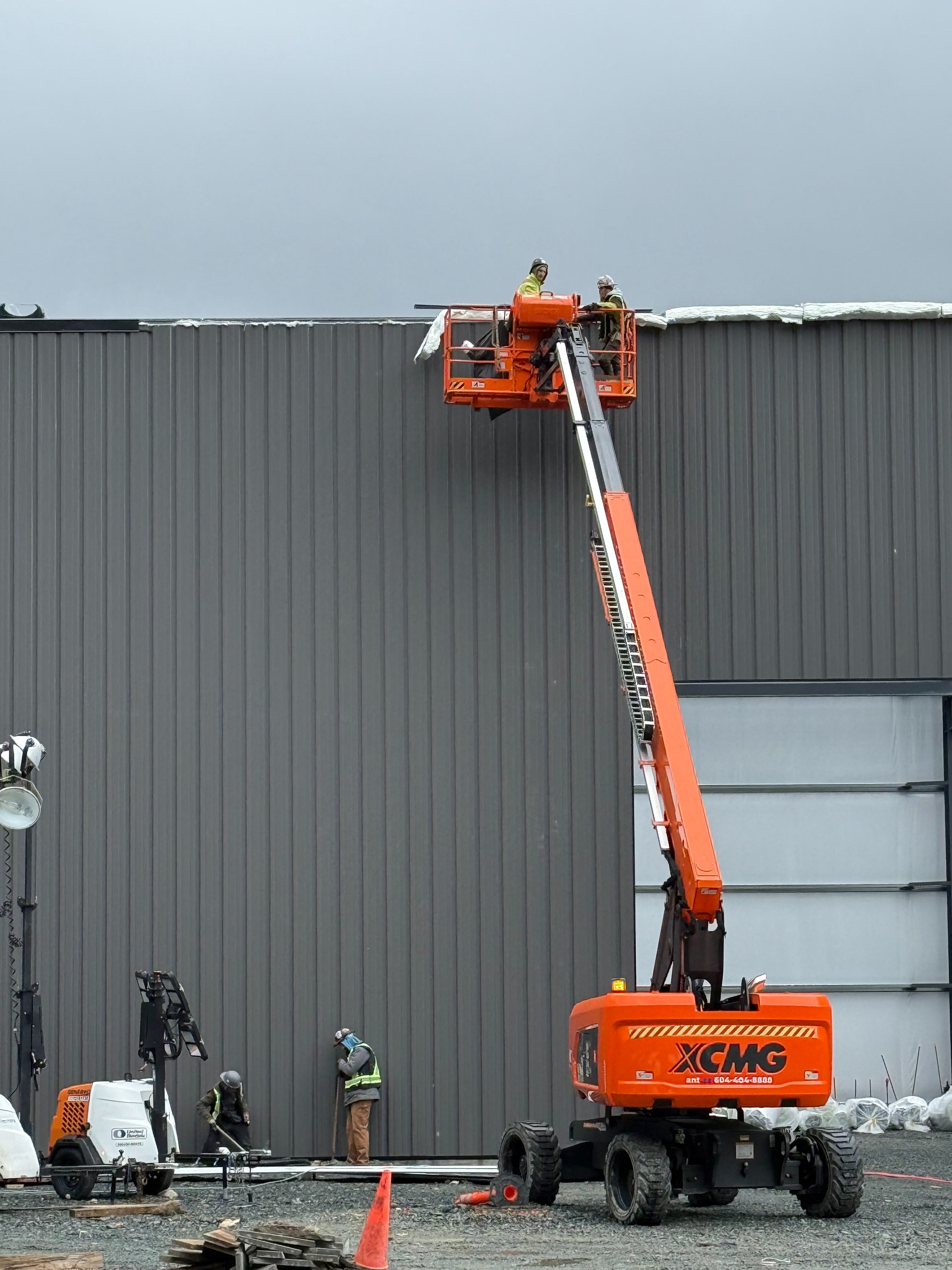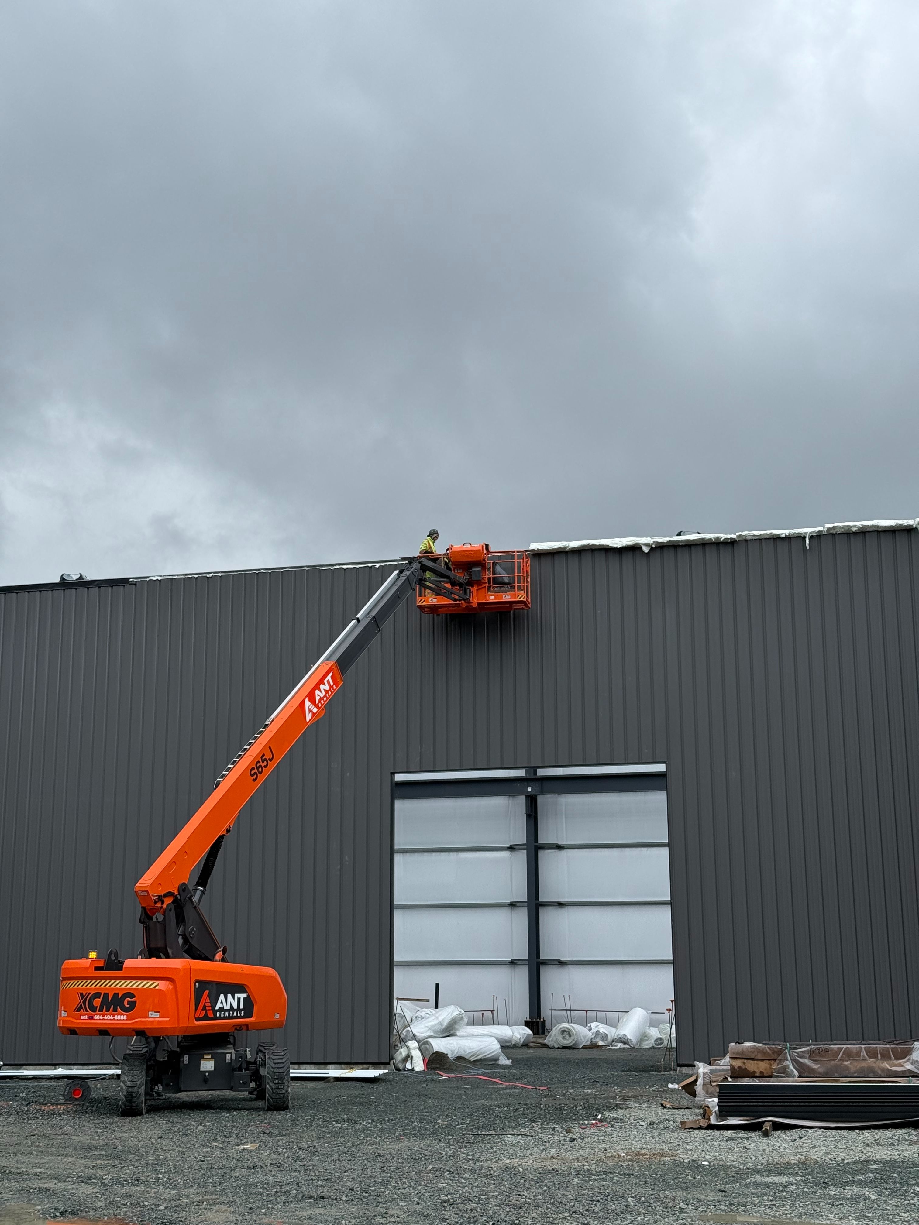 本次施工的厂房采用钢结构围护体系,外墙为深灰色波纹金属板,屋面需完成保温层铺设、檐口收边条安装等高空作业工序,作业点位位于厂房檐口处,对高空作业平台的作业高度、水平延伸能力及场地适应性提出了多重考验。同时,温哥华当地阴雨天气频发,工地地面为碎石铺装,湿滑泥泞的环境对设备的越野性能、防滑稳定性也提出了不小挑战。