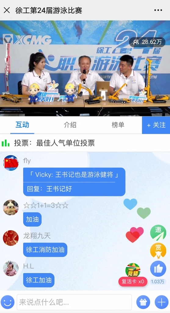 作为一名资深的游泳爱好者,比赛当天,健身达人——徐工集团工程机械有限公司党委书记、董事长王民也来到了现场观赛。他与参赛选手们亲切交流、互动,并做客直播间,与线上近37万观众互动,分享健身经历、畅谈健身体会。