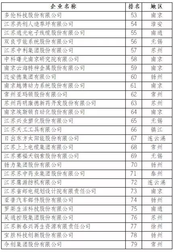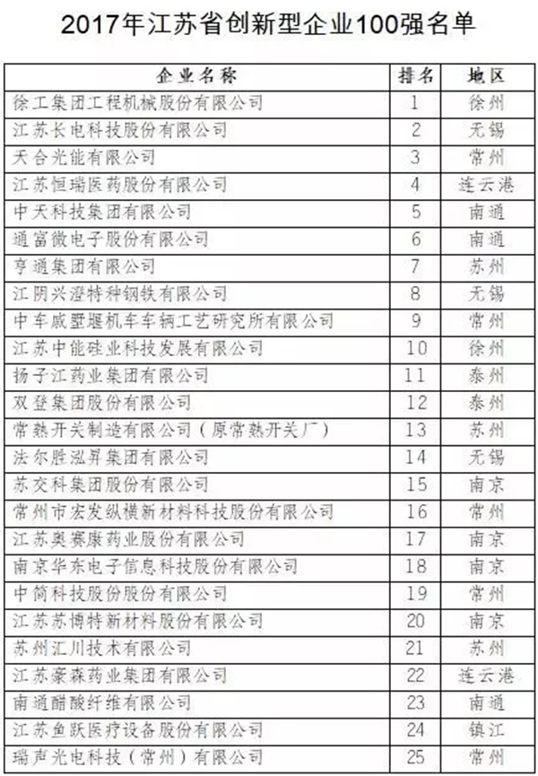 近日,江苏省科技发展战略研究院、省科技情报研究所发布了“2017江苏省创新型企业100强”名单。这是江苏省评选的第二届江苏省创新型企业百强榜单,苏南、苏中、苏北地区分别有64家、23家、13家企业上榜,与上年榜单相比,苏中、苏北地区分别增加5家、2家,徐工集团工程机械股份有限公司位列榜单第1位。