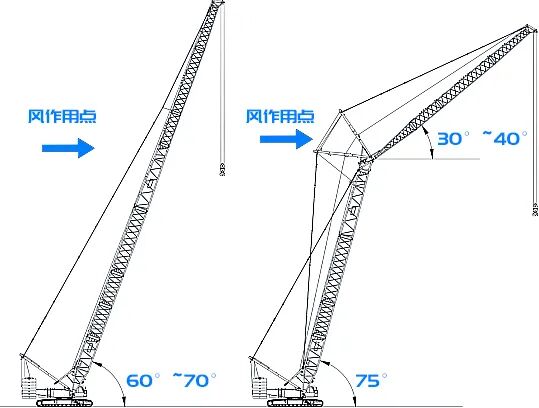 3.调整臂架仰角:主臂工况、臂端单滑轮工况、轻型主臂工况及风电副臂工况、盾构工况的主臂臂架仰角变到 60°- 70°;塔式工况的主臂仰角变到 75°,塔臂仰角变到 35°左右。