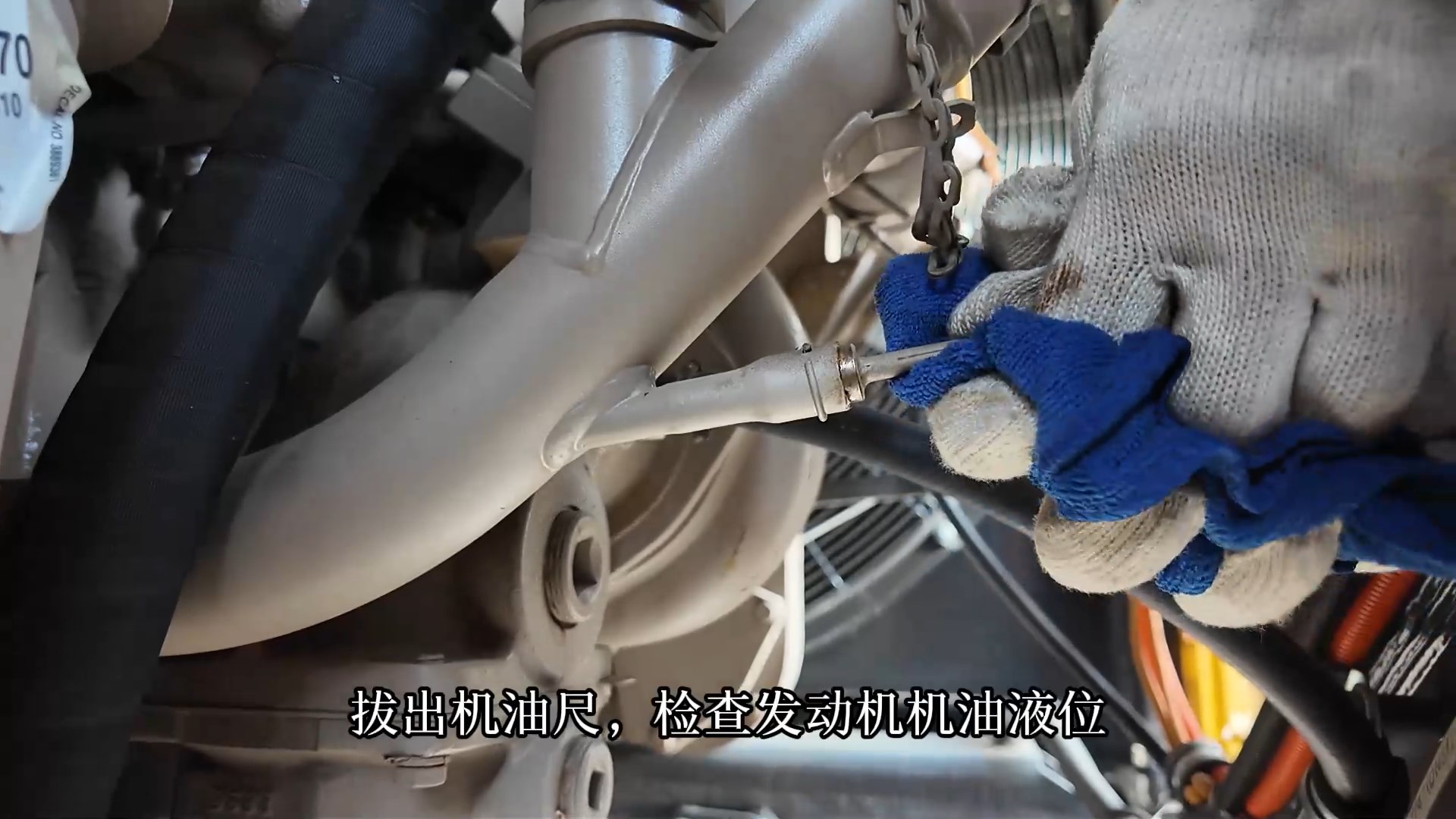 2.拔出机油尺,用干净抹布擦拭油尺表面的油液;