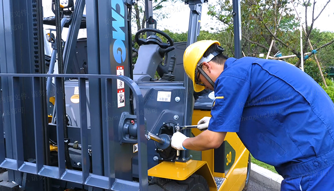 油位检查:每周至少检查一次液压油箱油位。油位过低会导致系统吸空,造成泵体磨损加剧;油位过高则可能在系统工作时溢出,污染环境。检查时,叉车应停在水平地面,货叉降至最低位置,观察油位计是否在上下刻度线之间。