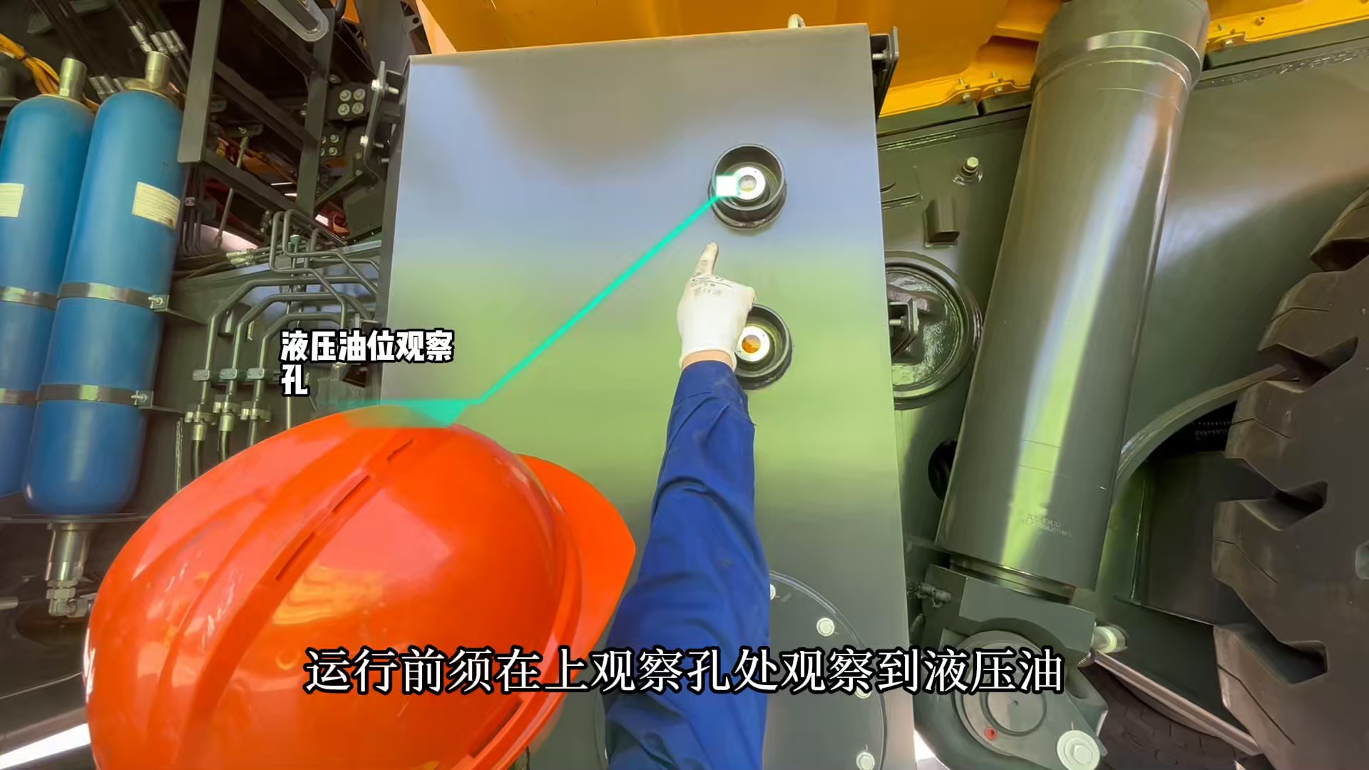 5.检查液压油快速加注口及管路、燃油箱管路及接口、固定件、油箱底部、加注口、呼吸器有无破损/泄漏。燃油油位在中部观察口之上。