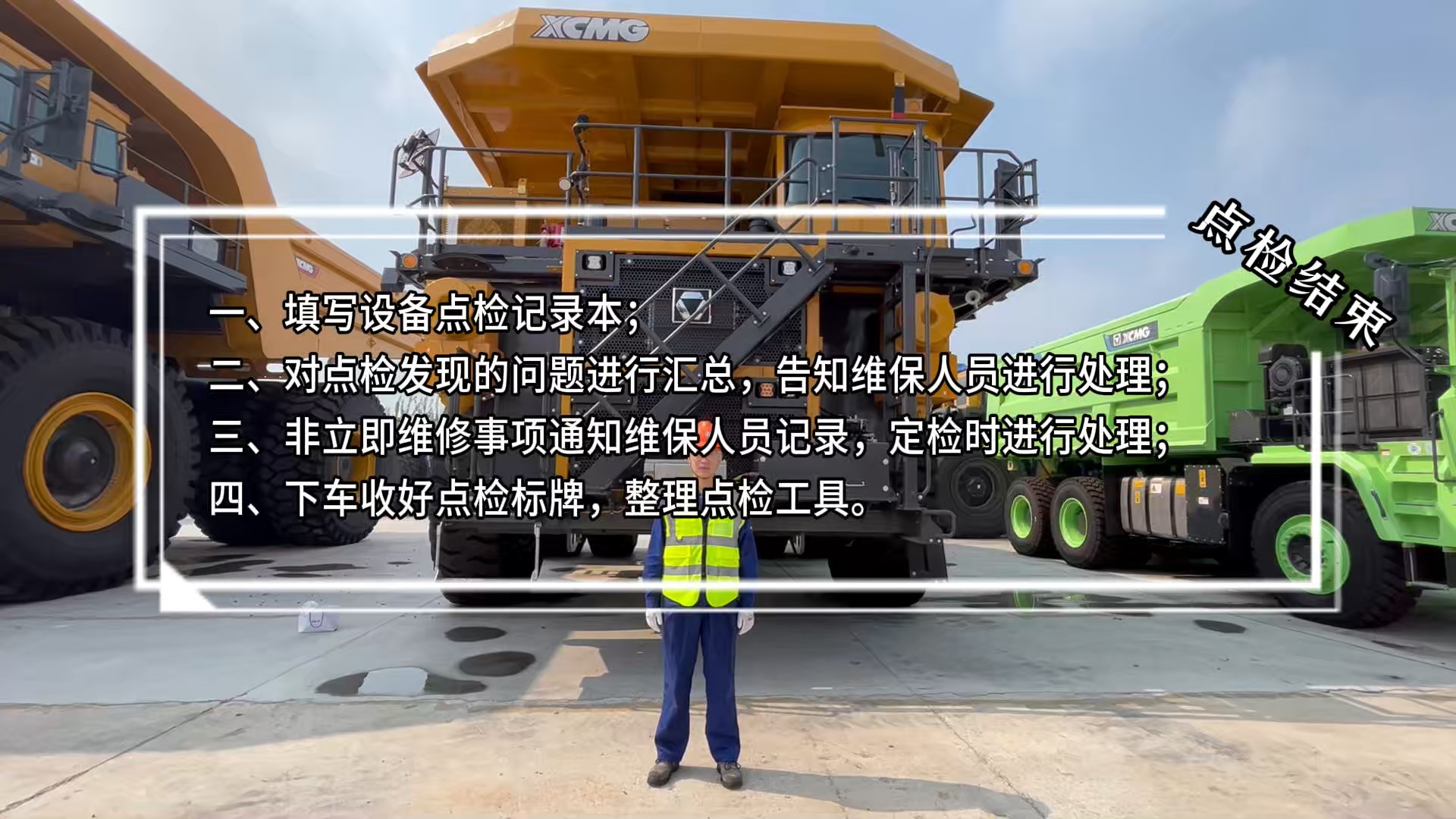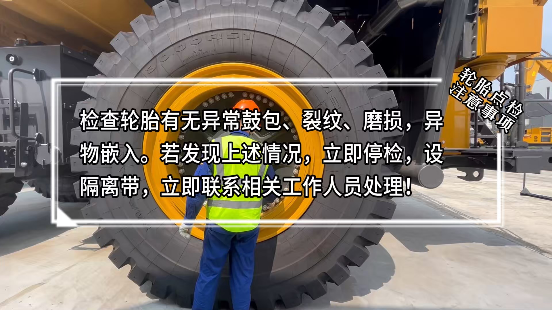 2.穿戴全套劳保,前后轮放置掩车器,挂点检牌、设警示带/路锥。准备点检工具。