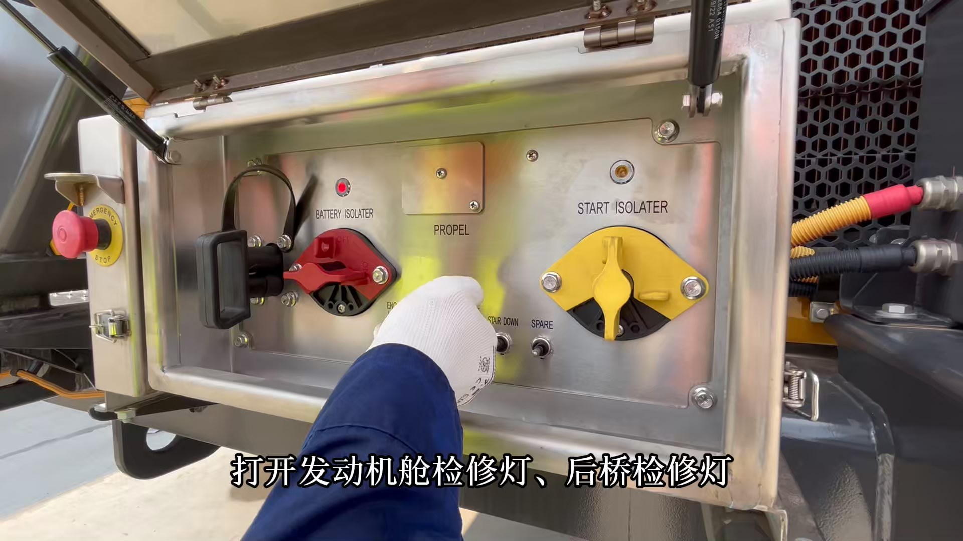 4.检查右侧甲板扶手/后视镜,灭火器(外观/压力),电阻栅百叶窗(损坏/杂物,清理周边)。
