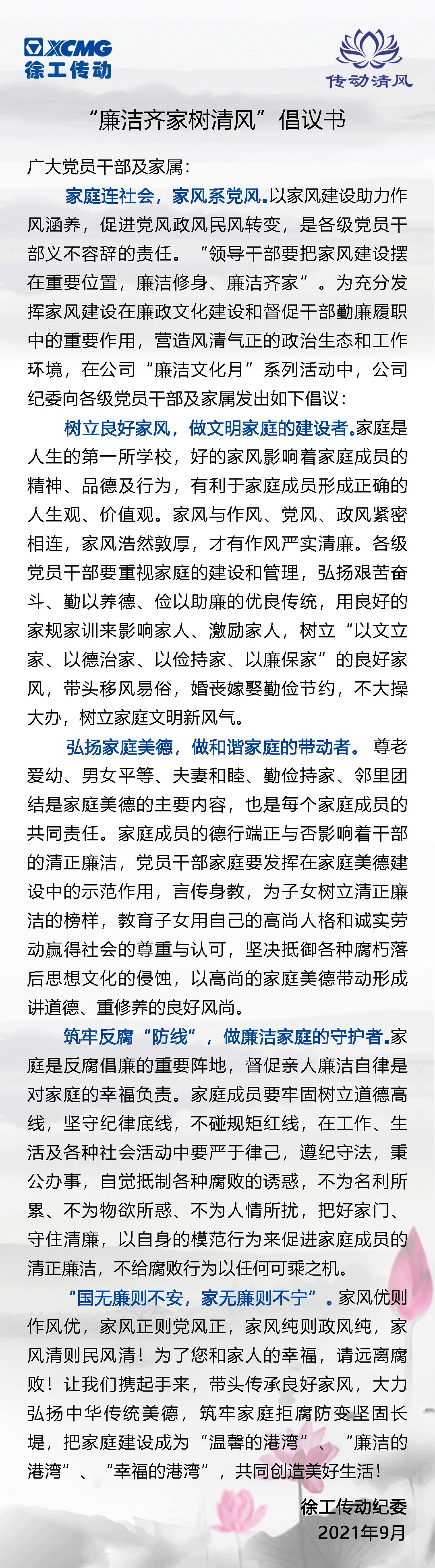 廉洁文化月 | 徐工传动“廉洁齐家树清风”倡议书
