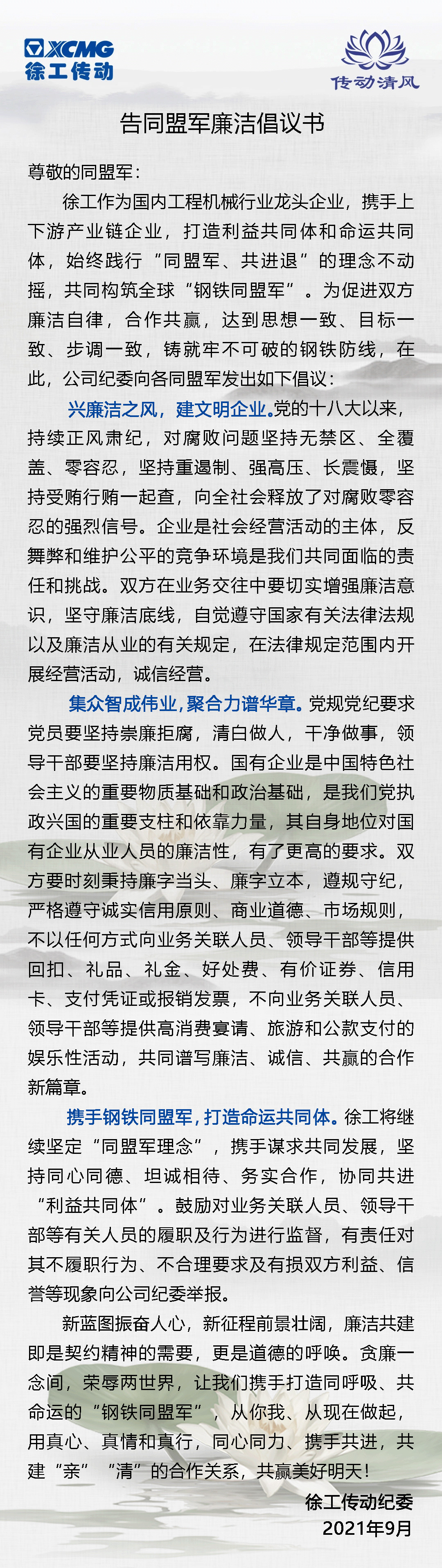 廉洁文化月 | 徐工传动告同盟军廉洁倡议书