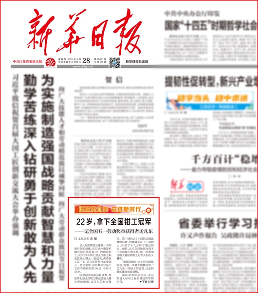 近日,我校20届钳工专业优秀毕业生孟凡东获全国五一劳动奖章,该生先进事迹被新华日报宣传报道。