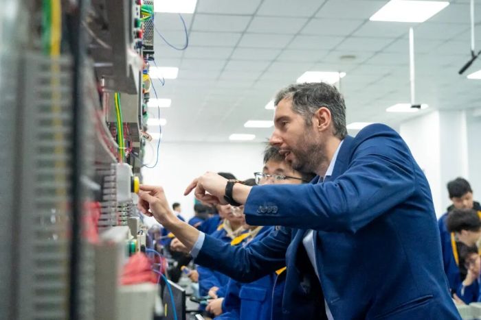 近日,德国埃尔福特培训中心教育集团资深培训师梅萨纳吉奇先生与富尔迈斯特先生为学院2023级“蓝海精英”班学生开展为期两周的PLC 编程应用与电气动技术专项教学指导。教学过程以德国“双元制”教育模式为核心,通过模块化实战练习,助力学生实现专业素养与实践能力的双重提升。