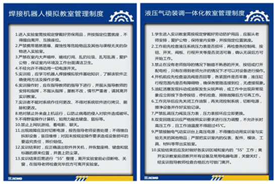 “没有规矩,不成方圆”。前期,学院组织各教研室教师制定、细化28个实验室的管理制度和相关实验设备安全技术操作规程,并将各种规章制度张贴上墙,组织师生学习,确保实验室管理有章可循,有规可依,有规必依。在此基础上,学院选派相关教师到兄弟院校就实验室管理、开放情况进行专项调研;多次召开实验指导教师专题座谈会,集思广益,经过多次的讨论、修改,最终出台了《徐工技师学院实验室开放管理制度》,制度中不仅明确了实验室开放原则、管理职责、开放流程,还公布了各个实验室所承担实验教学的课程、实验项目类别和实验课题方向等,为学生自主申请实验提供指导和帮助。相关规章制度的建立、健全为实验教学的开展及实验室的开放提供了制度保障,成为实验室使用和开放的最有利的措施。