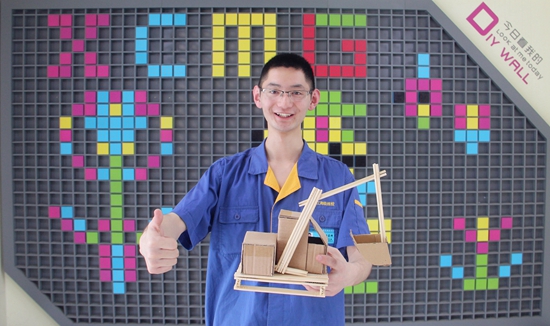 该作品以木棍、纸板为原材料变废为宝,通过设计构想、裁剪、粘接的流程,制作出“绿色环保挖掘机模型”,表达出徐工学子对工程机械的无限向往和热爱!