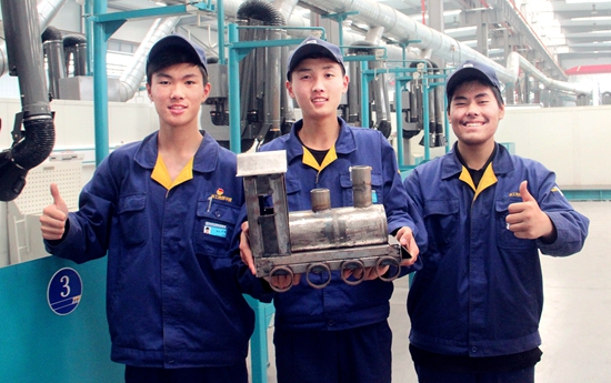 作品是呈现为“火车头”的外形,主要以不锈钢圆柱为材料,采用铆工工艺完成操作室、烟囱和地盘的制作,通过钨丝氩弧焊的技术将车身焊接而成,车轮与车体的连接实行点焊技术,这些技术充分的考验了我们团队成员的熟练运用焊接技术的能力。