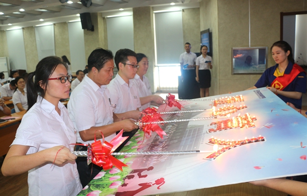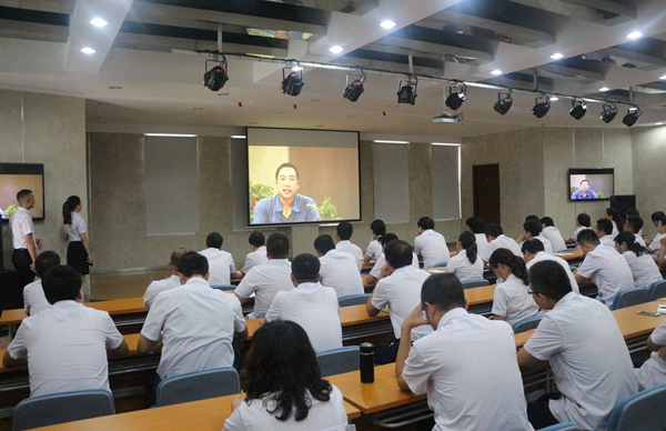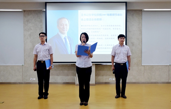 杨扬、王明、李超三位青年教师代表深情诵读,带领全体教职员工共同重温王民董事长的谆谆教诲。
