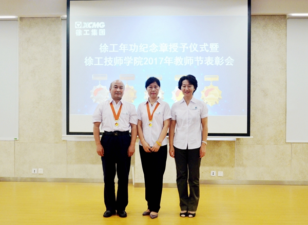 学院党总支书记、院长冯跃虹为获得35年“四星”徐工年功纪念章的两位教师李雪平、闫江陵颁发年功章。