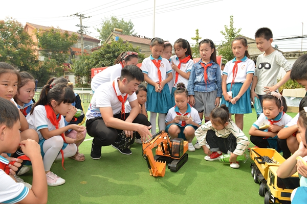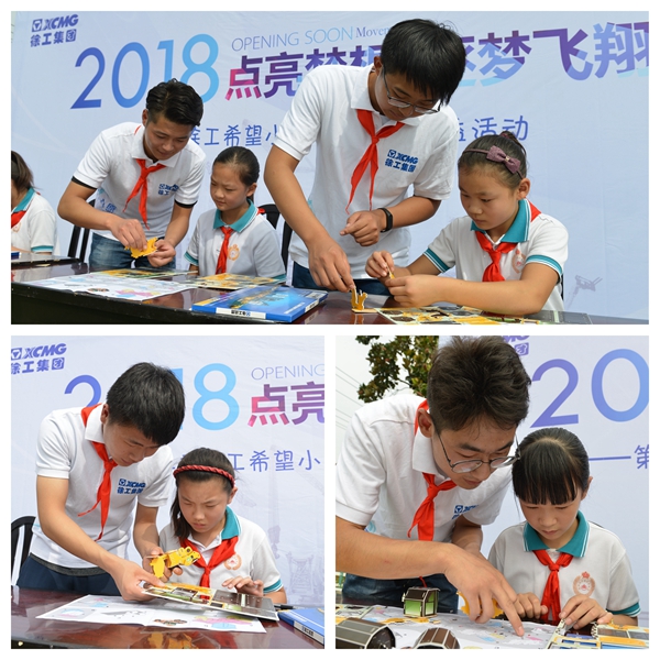 学院4名出类拔萃的技能精英担任起“梦想导师”,向苑山小学的孩子们详细讲解徐工产品名称和用途,演示缩小版徐工产品模型,并带领他们共同完成徐工产品模型的拼装制作,激发他们探索工程机械奥秘的兴趣。