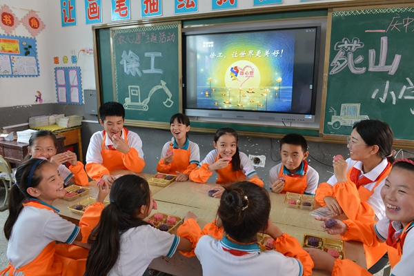 活动最后,学院师生还给孩子们送上美食“大礼包”,并带领他们共同制作印有徐工logo的月饼。擀皮,包馅,压模……孩子们沉浸在DIY月饼的愉悦中,幸福快乐的笑容洋溢在他们脸上。