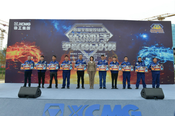 启动仪式上郭秘书长和侯秘书长共同为前期在首届全国旋挖钻机“钻级机手”争霸赛总决赛中获奖的10名“钻级机手”荣耀颁奖。