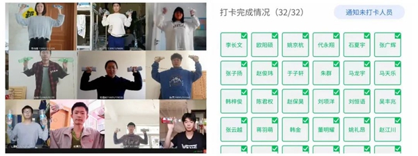 侯佳彤老师将活泼的音乐、简单易学的动作充分融合,利用视频连线指导学生把触手可及的生活用品变为训练器材,让居家锻炼更贴地气、更有成效。课后,她还组织学生进行keep打卡,用小软件服务真运动,助力学生提高身体素质。