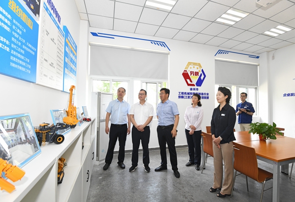 近日,江苏省总工会劳动和经济工作部副部长董雷一行莅临学院,对徐州市工程机械与智能制造劳模创新工作室联盟及李攀攀劳模创新工作室建设开展专题调研。调研组一行对创新工作室创建取得的建设成果、创新成果给予了充分肯定。徐州市总工会党组成员、副主席王建民,徐工集团党委副书记、工会主席甄文庆,徐工机械工会副主席朱姿春,学院党委书记、院长冯跃虹,党委副书记、纪委书记、工会主席牛杰等陪同调研。