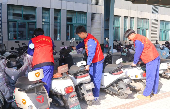 学院团委组织开展志愿服务活动,“志愿红”的身影们穿梭在校园的各个角落中,他们细心清洁实训设备、规范摆放电动车辆……正是这一抹“志愿红”,给校园带来了更多属于春天的盎然生机。