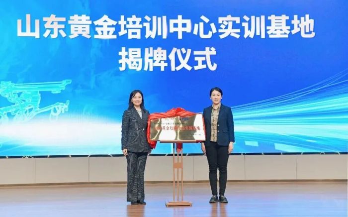 山东黄金培训中心校领导王伟霞与徐工全球学教中心党委书记、主任张丽娜共同为“山东黄金培训中心实训基地”揭牌