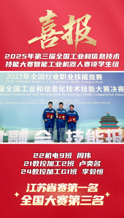 21数控加工2班卢奕名、22机电9班周伟、24数控加工G1班李毅恒三人组队直面挑战,在理论与实操双重考核中表现优异,以江苏省选拔赛第一名的成绩,从众多大中专院校中脱颖而出,代表江苏与全国百余名选手论剑山城。